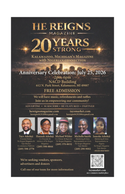 He Reigns Magazine is celebrating 20 years in publication! We are planning a community event on July 25, 2026, at the NACD Building, 612 N Westnedge Ave., from 2:00pm to 6:00pm.